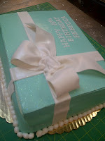 This was a simple cake. The customer wanted it to look like a Tiffany box, so the cake is on the bottom, and I made a 'cover' with rice cereal treats covered in buttercream then covered in Tiffany blue fondant. The box was finished with a bow and pearls along the bottom.